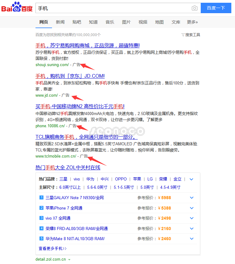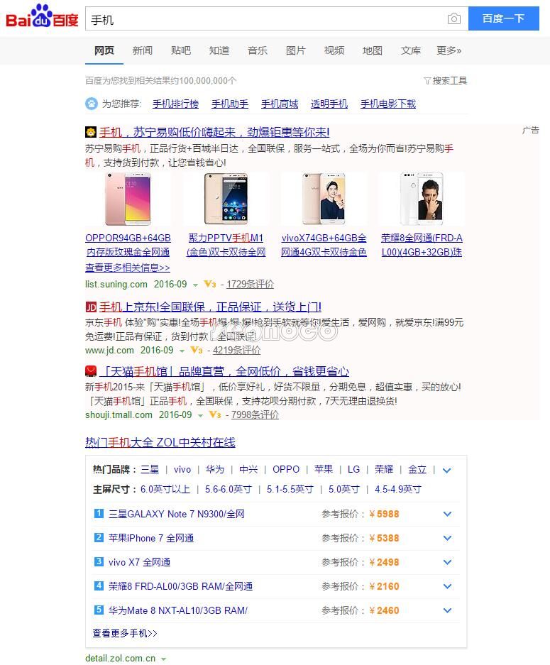 虽然谷歌搜索结果里区分CPC与自然排名也是AD两个字,但是GOOGLE在文字后面有个背景,还算比较醒目,百度在某些网站后面的加的官网两字并且设置蓝色背景就有相似的作用,但是对百度的竞价的广告却不能这么做!目的就一个,混淆!