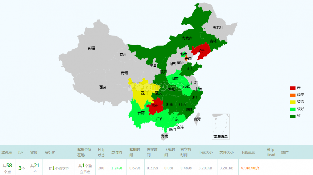 无CDN的情况下,把博客在17ce.com进行网站测速,大陆地区得到的平均值基本上在1秒-1.5秒,也有1秒以下的时候,当然这里也主要是因为有几个国内地区的数据影响了平均值,大多数地区还是在0.5-0.8秒的。