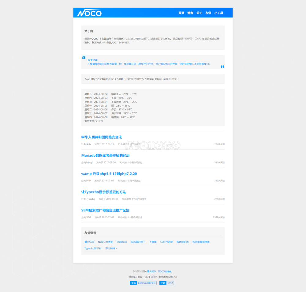 博客又更换主题了发布于 2024-08-02 分类 生活6小时前 有1个用户阅读过 博客有3年没有更换主题了,闲来无聊又根据当下的心情和审美折腾博客主题。以前每次更换主题都觉得当时是最完美的,回头再看这些老主题的时候,尴尬的一批!都有那么点难看。这是不是也算另一种进步。 顺便将近几年未记录的博客主题截图做个备份。 下图是2017年的主题bootstrap 下图是2019年的主题bootstrap4 下图是2020年的主题tiny 下图是现在的主题tiny2 -- The End --