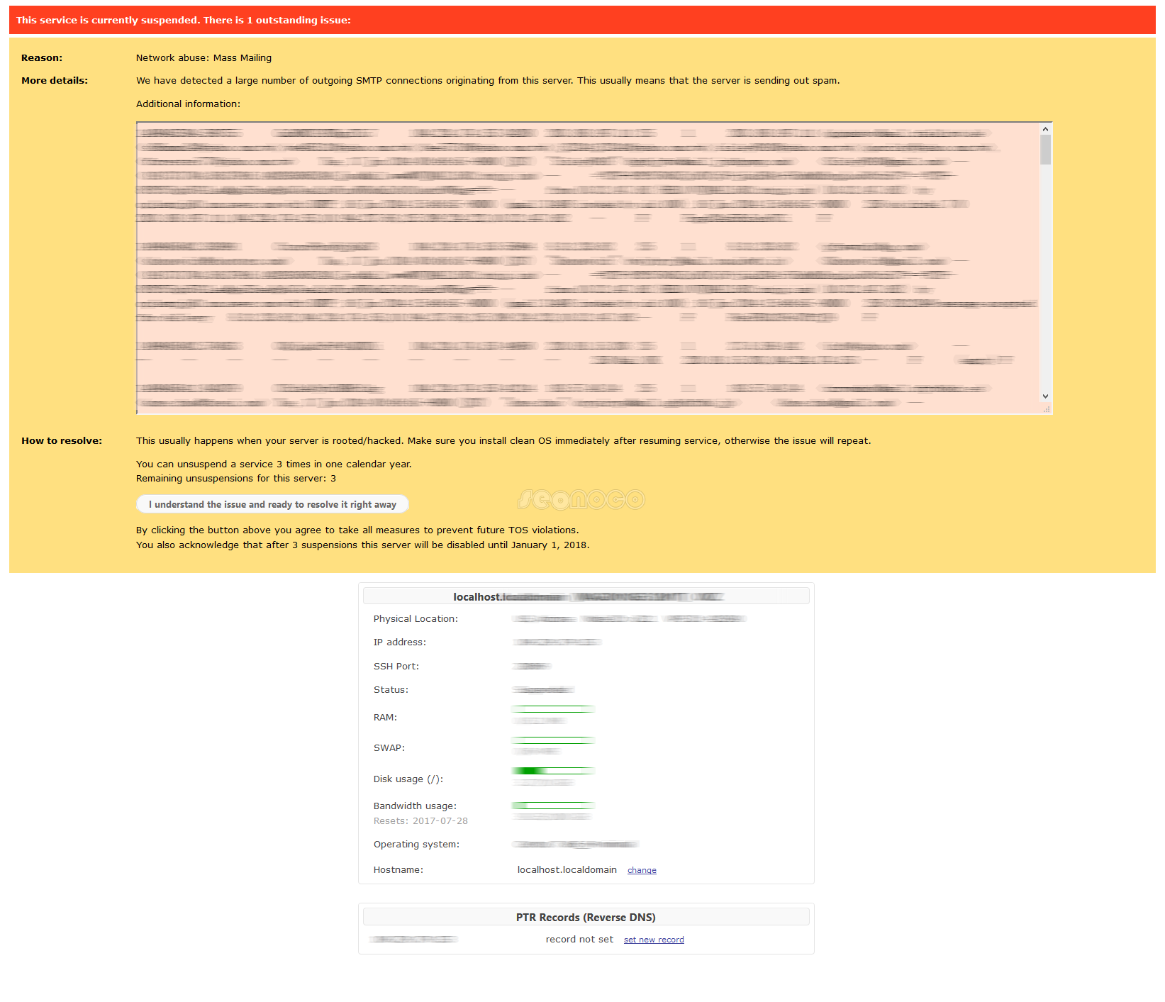 大致的意思就是VPS上发送了大量垃圾邮件,违反了ToS协议。每年有3次机会恢复,3次用完就直接被禁用,直到限定的时间后才解除!