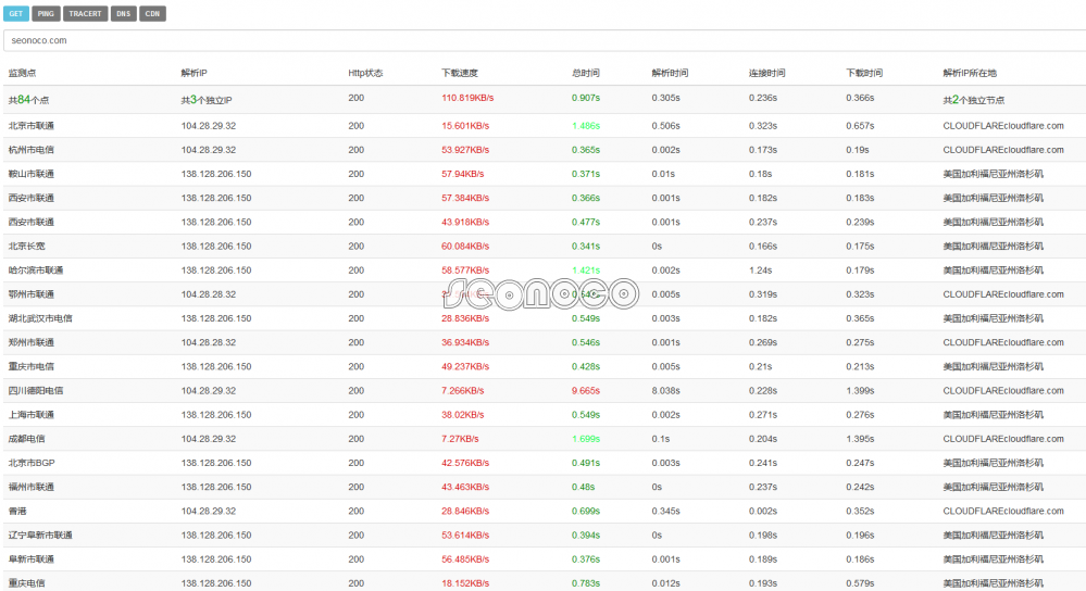 用了几天后,至少目前为止,CloudFlare免费版的就2个美国节点,而且似乎纯在一点点的疑似节点抽风的现象,导致国内访问节点似乎不稳定,所以我暂时去掉CDN了,先优化VPS和程序本身的页面加载速度,在给网站前台整体加上静态缓存后,速度改善还是比较明显的。