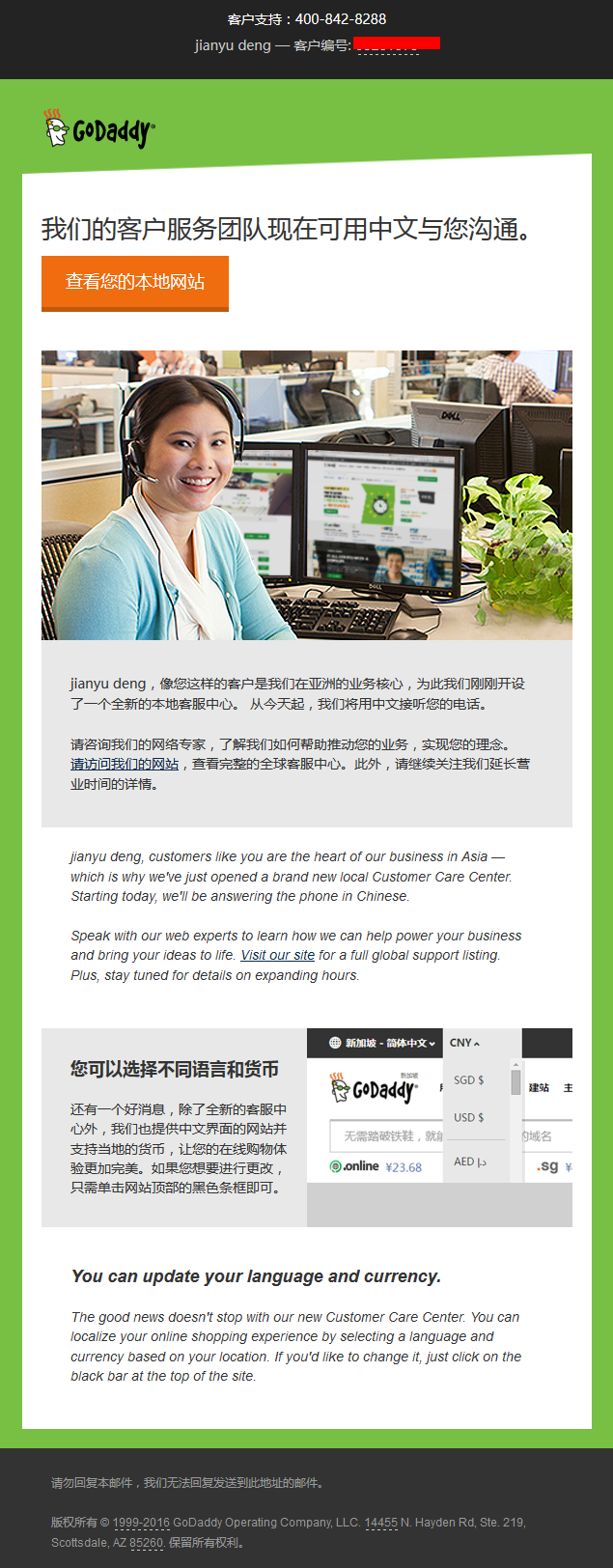 因此后来收到的GODADDY优惠信息邮件越来越多。后来直接新建了一个文件夹放GODADDY的邮件。平时也很少打开看,今天打开邮件,居然看到几封新邮件是中文标题。对于我这种英文穷人My English is poor(据传这句中式英文不好,不过印象中中学英文老师这样教过,早已不记得她是否还讲过其他正式一点的了,为什么上中学的时候老觉得英语老师都是好漂亮的呢,最喜欢被英文老师叫去训话了),用户体验一下就上去了。