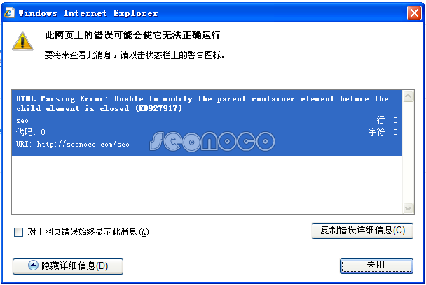 在IE8下浏览博客,发现有脚本错误html parsing error,如图: