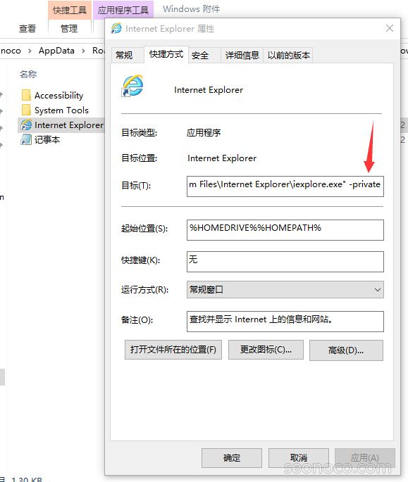 2.在开始菜单找到Internet Explorer快捷方式 开始--所有应用--Windows附件--Internet Explorer图标右键打开文件所在的位置,不是这个文件夹的Internet Explorer浏览器快捷方式,因为这里设置后锁定到任务栏无效。找到这个文件里的子文件夹Windows 附件里的Internet Explorer浏览器右键属性,如图,在目标T后面增加 -private即可。