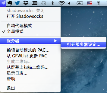Step3,进入Launchpad,打开ShadowsocksX,右上方出现程序图标,点击图标--"服务器"--"打开服务器设定"