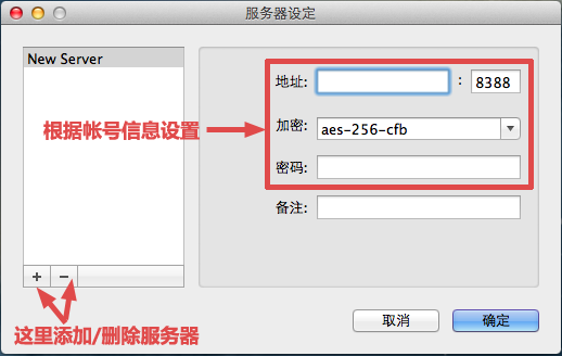 Step4,根据帐号信息,填写服务器地址(IP或者域名),端口,加密方式和密码,点确定