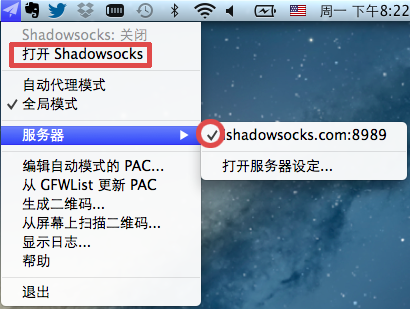 Step5,选择刚刚配置好的服务器,点"打开Shadowsocks",Done!