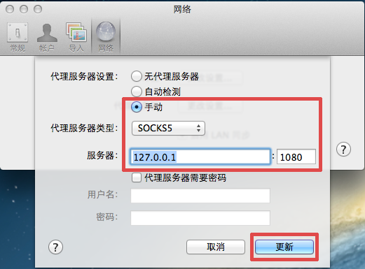 打开Dropbox首选项,"网络"--代理服务器"更改设置",然后按下图设置即可