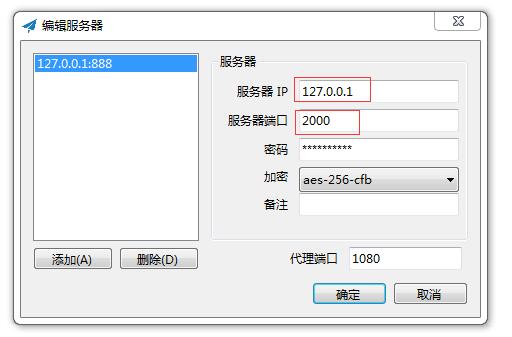 3. 打开 ss 客户端 , 添加服务器 , 服务器 IP 为 127.0.0.1, 服务器端口为加速端口对应的本地端口 , 这里是 2000, 然后设置你的 ss 密码 , 加密方式 .
