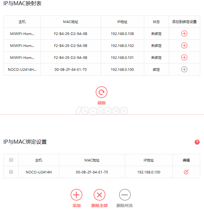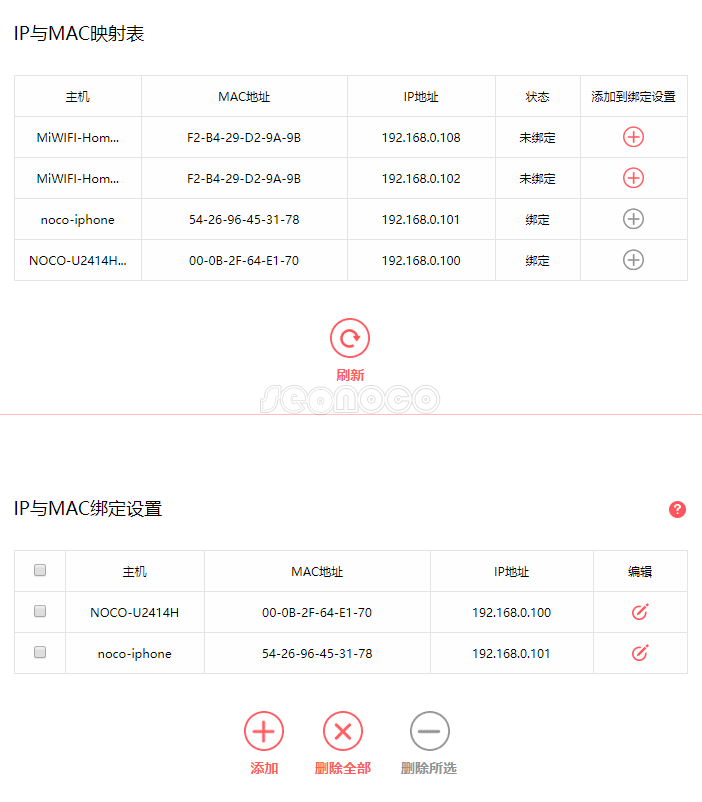 然后我再对比了一下 高级设置—IP与MAC绑定—IP与MAC映射表 的变化情况,确实是在未绑定MAC时,手机的主机信息和MAC信息会随着选择的wifi信号不同而变化。