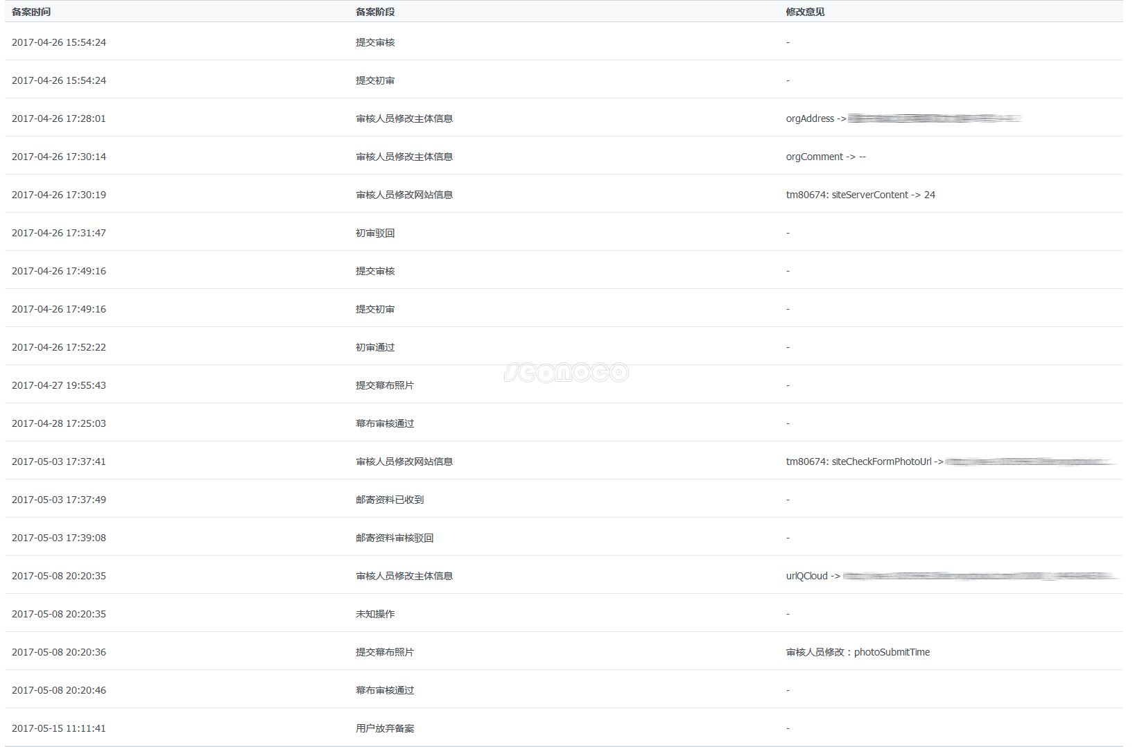 因为5月1日的关系,节假日应该不上班,所以5月3日,我在备案记录里查询显示邮寄资料审核驳回,但是除此之外,我没有收到任何的邮件或者短信通知信息。为了了解腾讯云的效率,我并没有及时主动发工单给腾讯云客服去获取是哪里失败了。