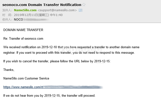 4.(大致等了10几分钟) 收到nameslio的转移确认以及通过URL取消转移的邮件。 这一步后默认几个工作日完成转移。
