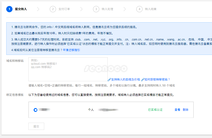2.(基本上没有什么等待时间)检查邮箱中的转移码,登录腾讯云的域名管理并按照提示输入域名以及转移码。