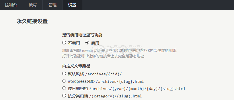 Tyoecho去掉网站所有页面链接中的index.php需要在typecho后台设置--永久链接设置--启用 是否使用地址重写功能。如果是apache环境,同时会默认在根目录生成相应的.htaccess文件,文件内容参考后面的内容。如果是nginx,需要人工设置一下规则!