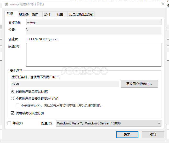 到这里并没有结束,需要针对创建完成的任务,点击属性,设置使用最高权限运行,否者也是无法正常启动 (会在任务中显示:请求的操作需要提升)!