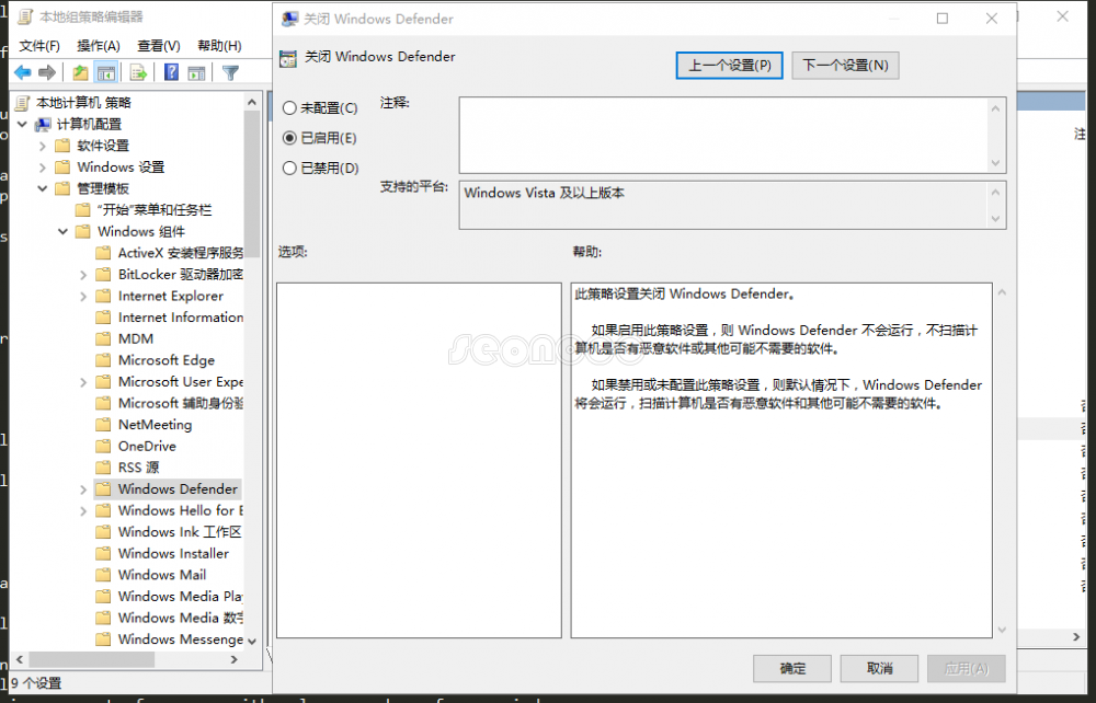 依次找到 计算机配置—管理模版—Windows组件—Windows Defender—关闭 Windows Defender,配置启用即可!