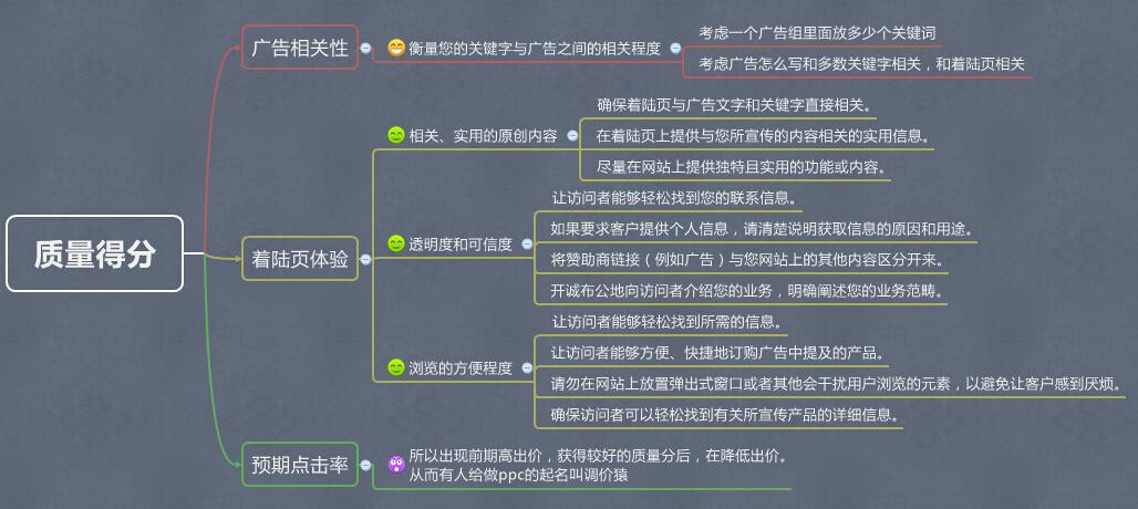 质量得分 -> 预期点击率, 广告相关性, 着陆页体验