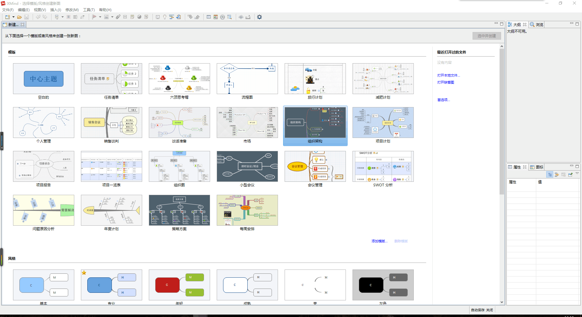 下图是XMIND安装启动后的截图,请看"组织结构"模版。