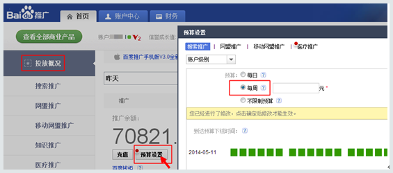 除日预算外,百度还提供了更加便捷的周预算设置功能。 功能说明:周预算是您每周愿意支付的最好推广费用,百度会根据流量变化,智能的将预算分配到本周的每一天,保证您的推广每天都能获得网民青睐。对于网站流量每日变化的企业来说,设置周预算更加灵活、划算。相对充裕的周预算能增加分配是的灵活性,使您的预算分 ...